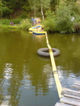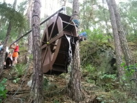 - Ve svahu nad WC se rozjelo dvoumetrové mlýnské kolo a hezky si klapalo. Bylo po skončení tábora věnováno do „mlýna“ nad táborem.