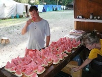 - Počasí nic moc, ale stíháme vše přivézt a do hangáru uklidit. Stany se ale staví za deště. Noční hra je postavená na lovu srnek Lovci mamutů. Ulovení musí pak v táboře splnit úkol, který jim lovci dali, ale pak lovci tyto úkoly plní také. Druhý den se všichni při vycházce oblékají jako lovci mamutů a takto se i dostavili před „boží soud“ do rehabilitačního zařízení na Vožeháku nad fotbalovými kabinami. Každý zde musel se ve verších vyzpovídat a posléze se pokřtít dovnitř různými voňavými kapalinami. Horší bylo se dostat zpět do tábora, neboť cestou nás zastavil Jirka Námořník a jemu jsme pak dokazovati museli naše fyzické i pitné schopnosti. Vše ukončeno následující den sportem náročným.